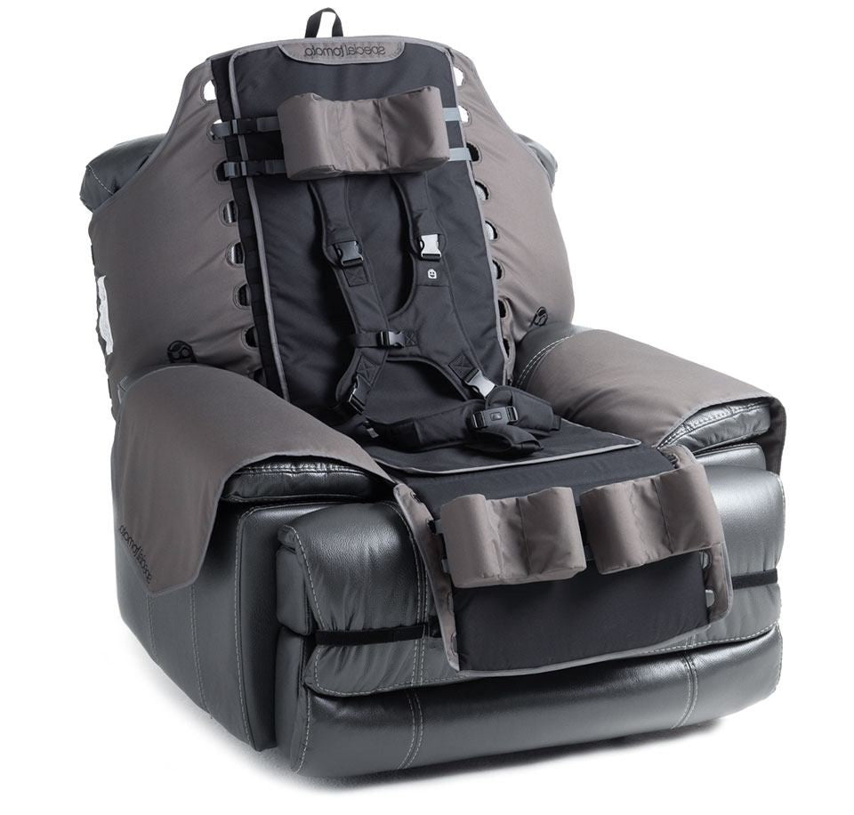 The Special Tomato Recliner Support System (RSS) comes with an adjustable 5-point chest harness and 3-point pelvic harness to safely maintain a stable well-aligned position of the trunk and pelvis. The RSS offers a firm yet comfortable platform for positioning the hips and pelvis for proper body alignment. The adjustable height headrest promotes a midline position of the head and the leg supports with height and lateral adjustability to cradle lower extremities in neutral alignment and discourage hyperextension of knees. The easy to clean drape is secured with four padded straps to protect furniture and will work with most recliner brands.