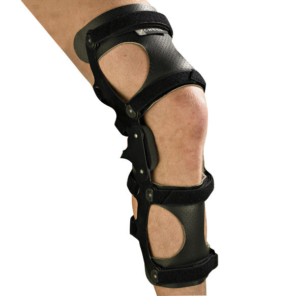 The C.H.E.C.K. brace comfortably controls hyper-extension of the knee. A dual axis hinge on each side of the brace allows the four parts to move independently, from extension to flexion, enabling the orthosis to follow the natural movement of the leg and prevent the brace slipping down the leg. The low profile uprights can easily be shaped to fit the contour of the leg to create an orthosis that becomes virtually unnoticeable under clothing.