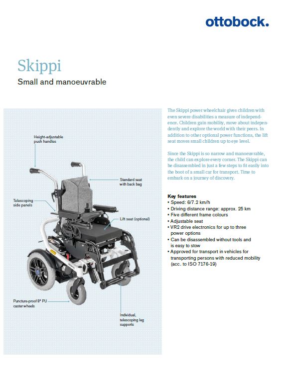 The Skippi Powerchair from Ottobock gives children a great deal of independence and is ideal for active kids who like to get out and about. Children gain mobility, move about independently and explore the world with others. In addition to other optional power functions, the seat lift moves children up to eye level. Since the Skippi is so narrow and manoeuvrable, the child can explore every corner. The Skippi can be disassembled in just a few steps to fit easily into the boot of a small car for transport allowing families to pack up and go on holiday with ease.