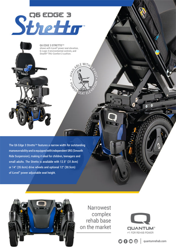 With a 20.47” overall width, when using 12.5” drive wheels, the Edge 3 Stretto is the narrowest, most compact and manoeuvrable power base in the Quantum range, and is ideal for kids, teenagers or smaller adults, who regularly navigate tight corners and small spaces at home, work, or in school environments.