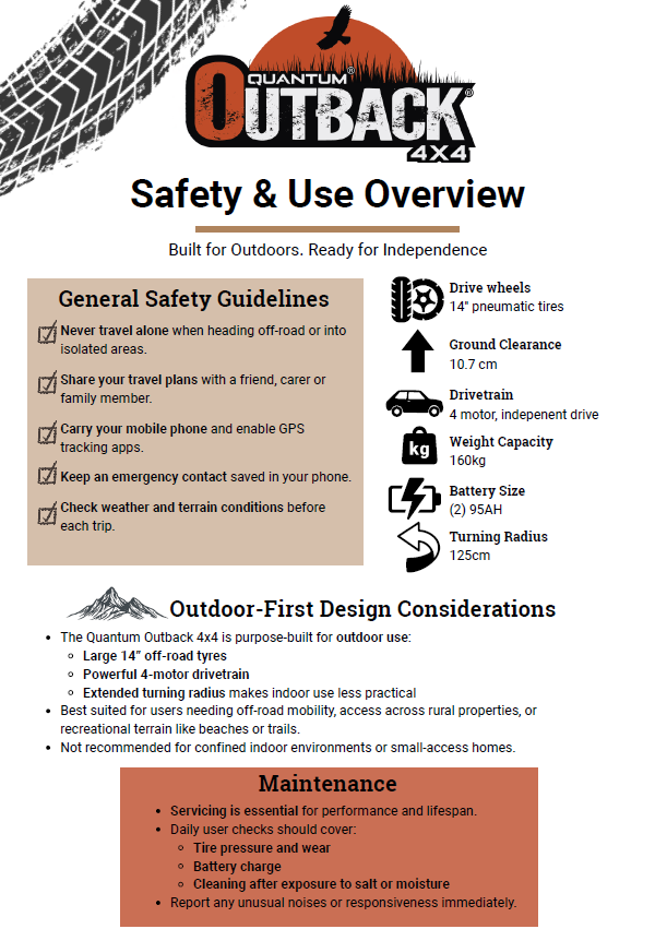The Quantum Outback 4x4 comes with the latest Q-Logic 3 Expandable Drive Control System and Quantum’s TRU-Balance 3 Power Positioning System. Whether you're navigating through bush tracks, gravel paths, or wide-open country properties, the Outback 4x4 gives you the freedom to explore new terrain without limitations. With off-road pneumatic 14.5” knobby tyres, exceptional ground clearance, and the ability to climb obstacles up to 10.2 cm, the Outback 4x4 is built for strength, durability, and unmatched performance.
