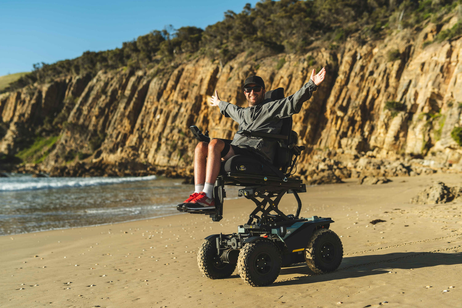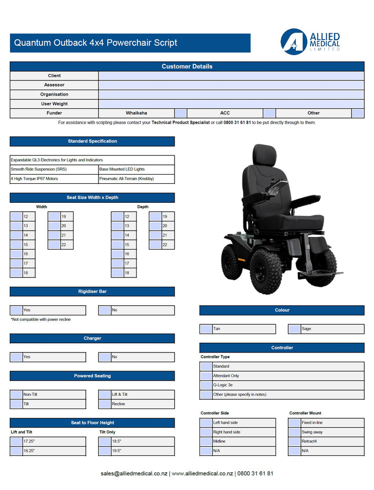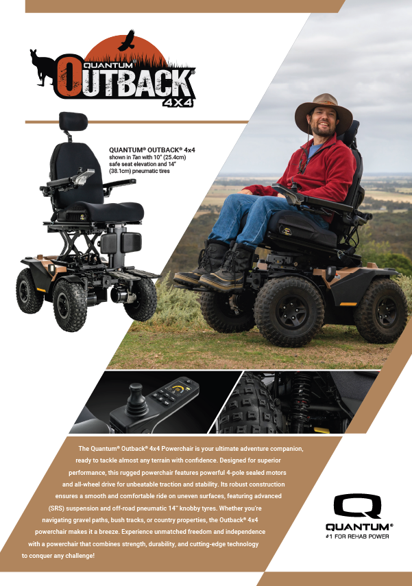 The Quantum Outback 4x4 Powerchair is built for off-road adventures, delivering unmatched performance on any terrain with its all-wheel drive and powerful 4-pole motors. Featuring advanced suspension and durable 14.5" knobby tyres, it ensures a smooth and stable ride wherever you go. Experience the freedom to go anywhere, with the power, durability, and reliability of the Quantum Outback. Explore your world with confidence, knowing that nothing will hold you back!