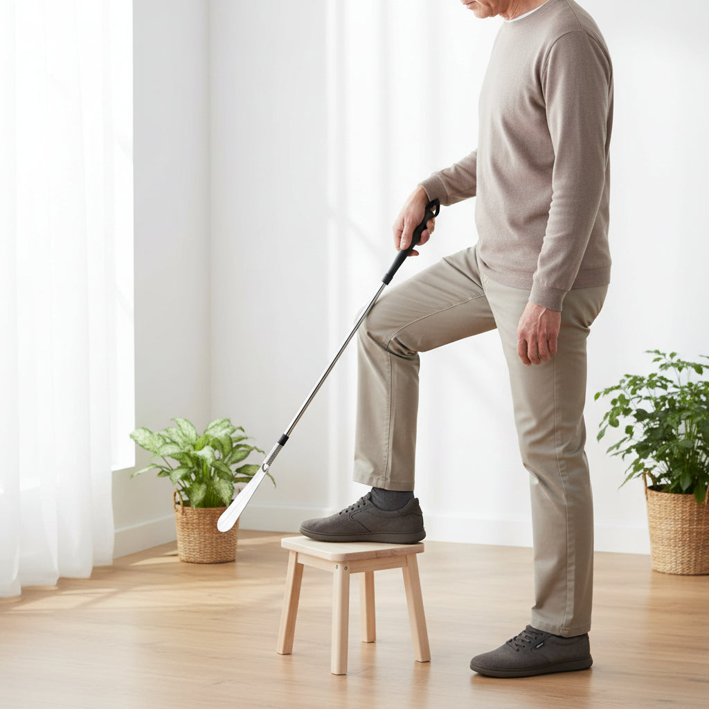 This shoe horn has extra length to help put shoes on without bending over. A flexible spring helps the foot to slip easily into the shoe.