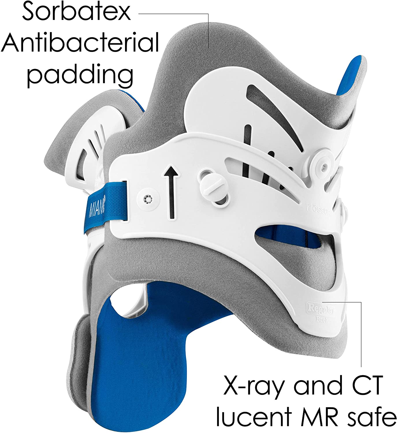 Miami J is bioengineered to minimize key pressure points like the chin or back of the head. It features comfort adjustment angulation buttons to fine tune fit and relieve pressure, and flexible sternal pads that can be removed for eating, excessive swelling, or for sleeping comfort.