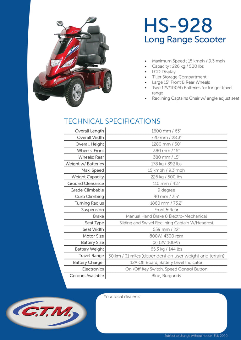 The CTM HS-928 is a robust four wheel scooter for those who want to do the distance! It is a great scooter for larger users or for those wanting to go longer distances, as this heavy duty scooter will deliver. Its sporty design and numerous safety features makes it very comfortable to drive and a really eye catcher.