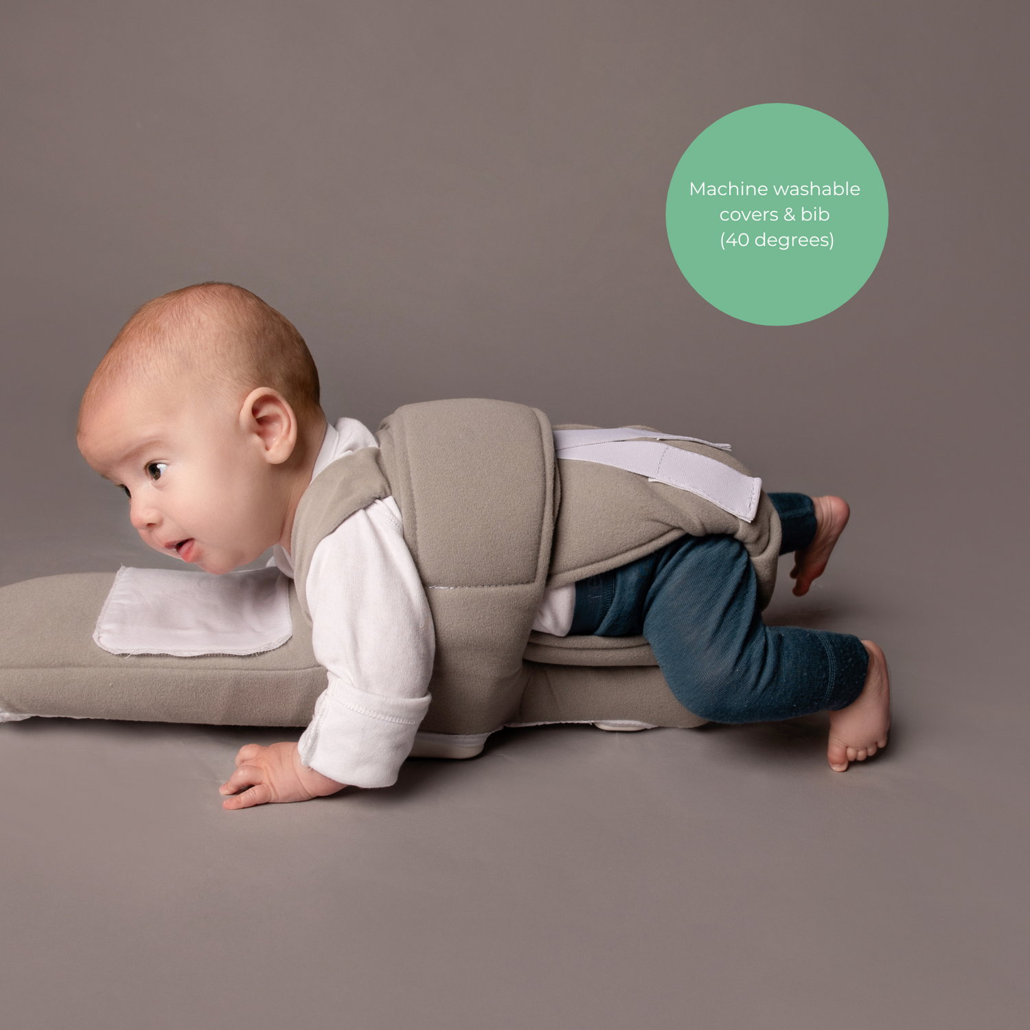 Daytot Joey has been designed with growing babies in mind. The patented design of Size 1, ensures that the baby’s pelvis is low to the ground, facilitating a flexed newborn position. Whereas, the unique design of Size 2 raises the baby's hips. This facilitating reciprocal movement and allowing for full flexion and extension of the leg, hips and arms.