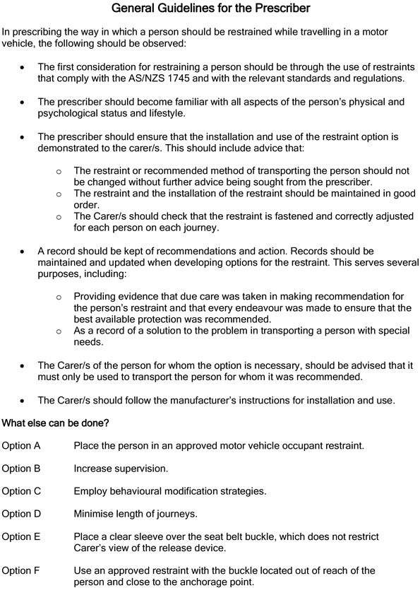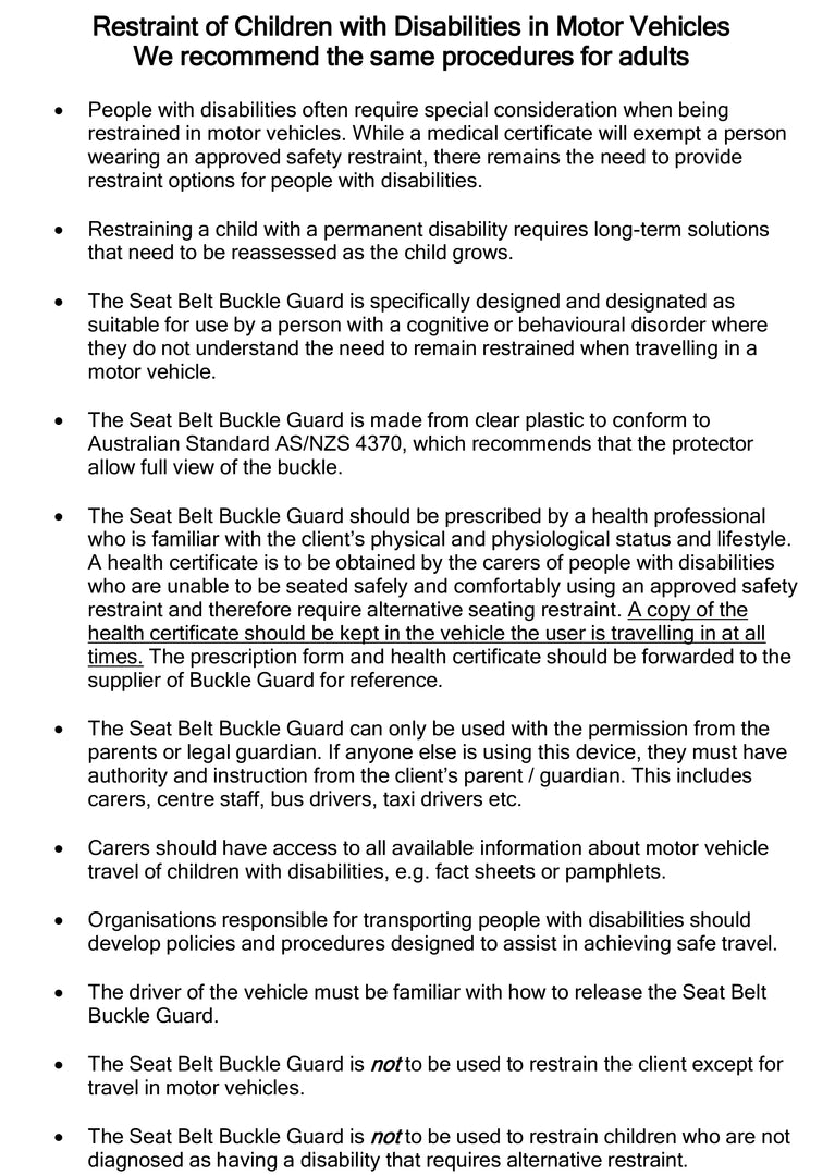 As per the standards for Restraint of children with disabilities, or medical conditions, in motor vehicles - AS/NZS 4370:2013, a letter from the user's prescriber should be kept in the vehicle where the seat belt restraint is used. The letter should outline the medical condition/disability reason why the Buckleguard has been prescribed as a seat belt restraint. We recommend the same process for adult users.