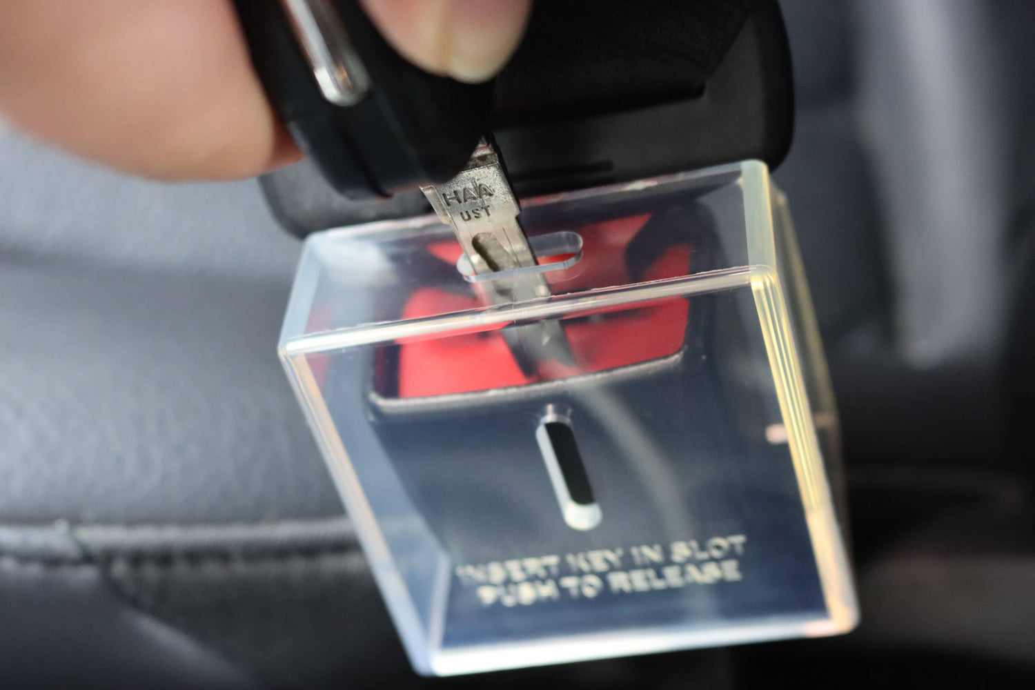 A simple solution for those who are able to escape from car safety harnesses and may endanger themselves or others in a vehicle. This strong and difficult to break cover slides over the seatbelt buckle to prevent the wearer from releasing the belt themselves. A caregiver can then safely and easily release the belt by inserting a key or coin into a slot when the destination is reached.