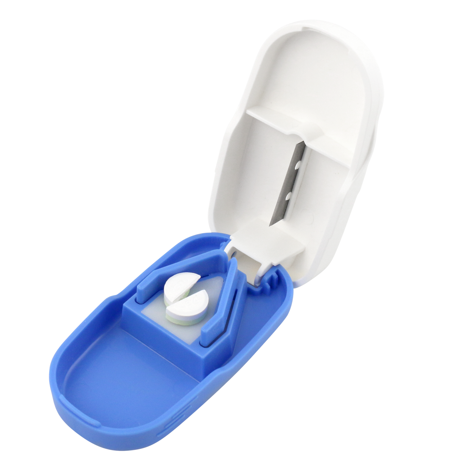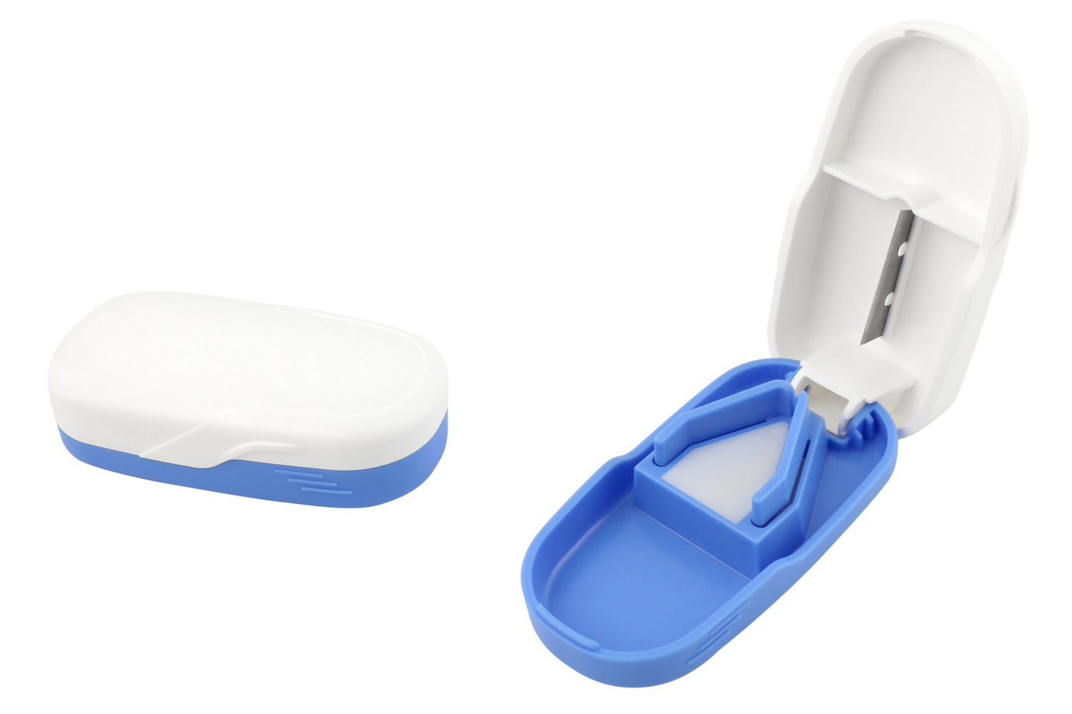 A device with a blade that splits tablets to make intake easier. The cover contains a blade that divides tablets in half for storage of small doses for easy swallowing. You can also store tablets in the compartment.