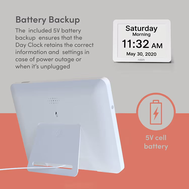 The Robin Day Clock has been thoughtfully designed to make everyday time awareness simple and stress free. Unlike many day clocks with hard to reach rear buttons, Robin features easy access side buttons with clear on screen labels, making it simple to adjust settings even when wall mounted.