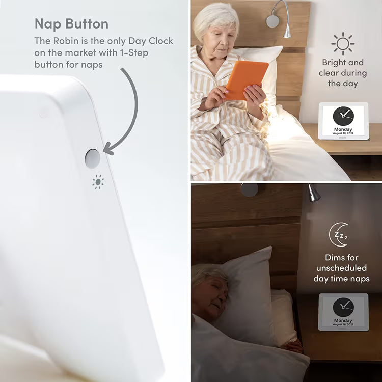 Auto-dimming ensures the screen is not too bright during sleeping hours. Dimming times can be scheduled to suit your preference. Additionally, a Nap Button instantly dims the screen to 10% brightness for the next 4 hours. Perfect if taking a nap during the day.