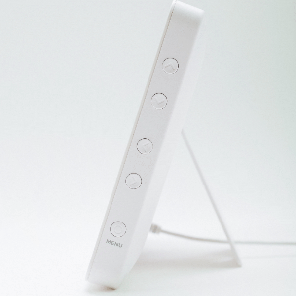 Most day clocks have their buttons on the rear, making it difficult to set/cancel alarms and reminders. Robin Clock has easy access side buttons with on-screen contextual labels, making it incredibly easy to use. The buttons are beautifully tactile, making them easy to find without looking. Buttons can also be locked to avoid unwanted changes.