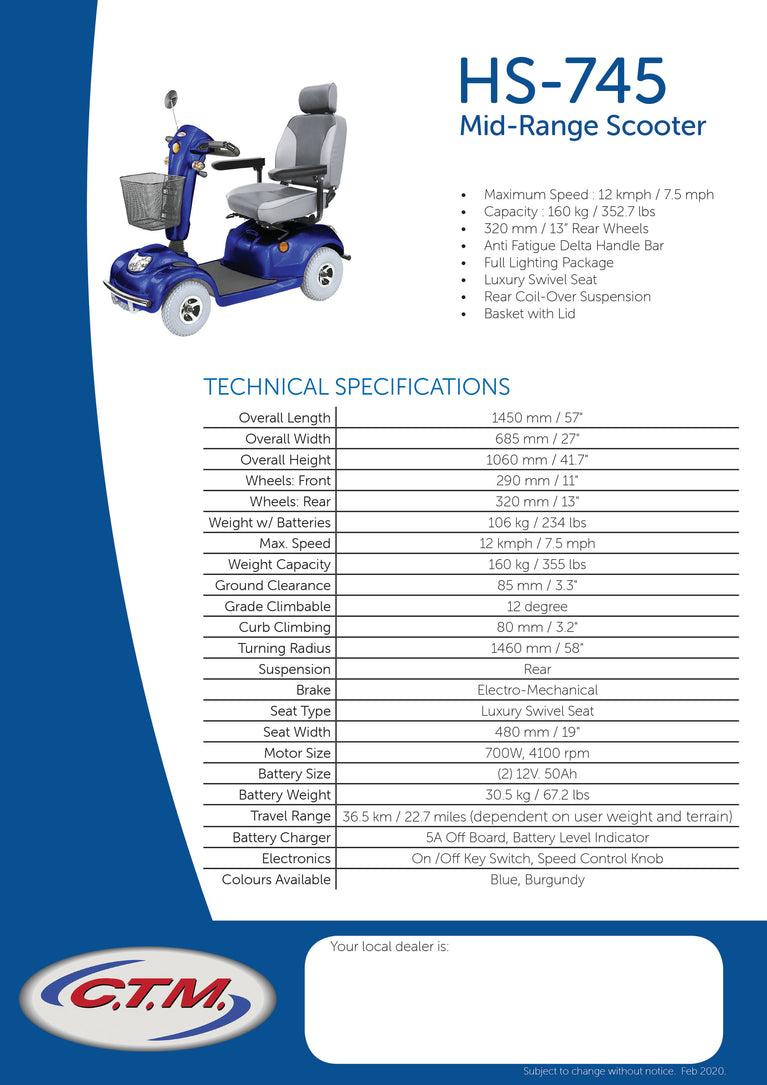 Available for purchase through our partner stockists. View our stockist page to find your local stockist. The HS-745 four wheeled electric scooter is a full sized, deluxe road class electric scooter with a rear suspension and 160 kg user weight limit. It is an electric scooter that has larger dimensions and has been designed for a comfortable ride and can tolerate the likes of gravel paths. Let it take you where you need to go - in style.