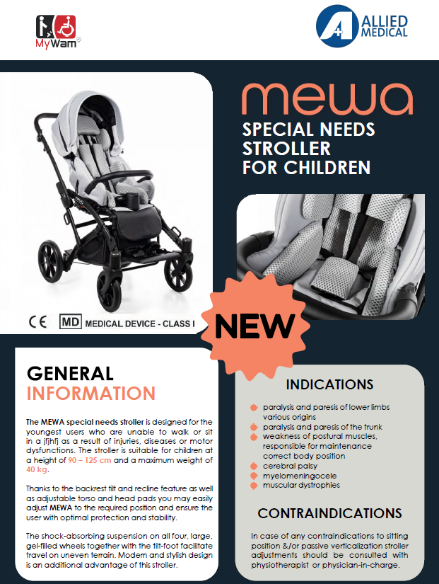 The MyWam Mewa Stroller is a highly adaptable stroller designed for children who require extra support due to motor dysfunctions or other conditions affecting mobility. Suitable for children with a height of 90-125 cm and a weight of up to 40 kg, this stroller offers exceptional stability and comfort, making it ideal for both everyday use and longer journeys.