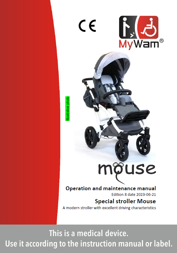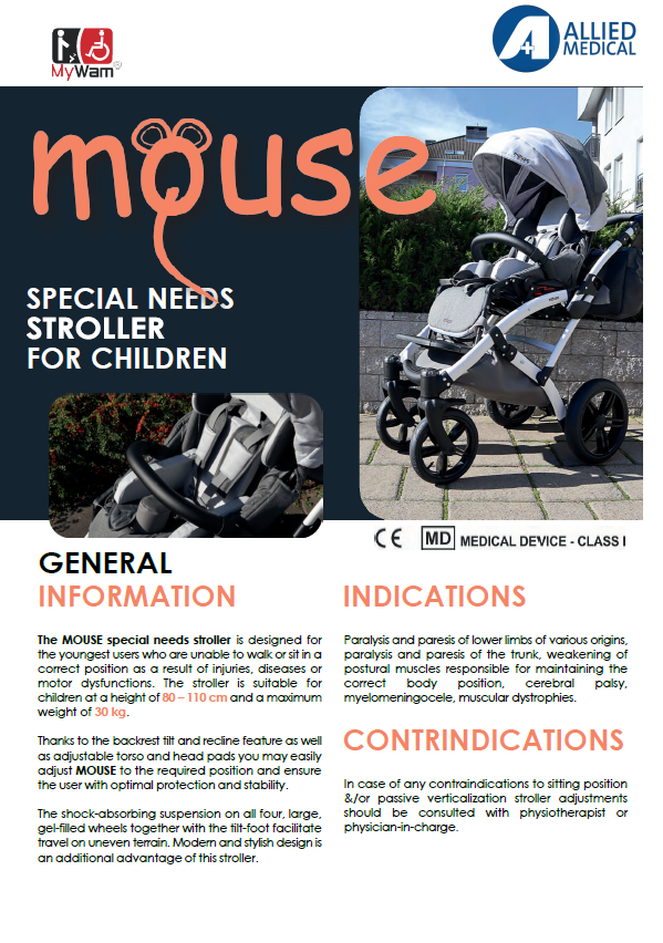 The MyWam Mouse Stroller is specifically designed for the smallest children who require additional support and comfort due to motor dysfunctions or other conditions. Ideal for children with a height of 80-110 cm and a weight of up to 30 kg, this stroller offers a blend of functionality, safety, and modern design to meet the unique needs of your child.