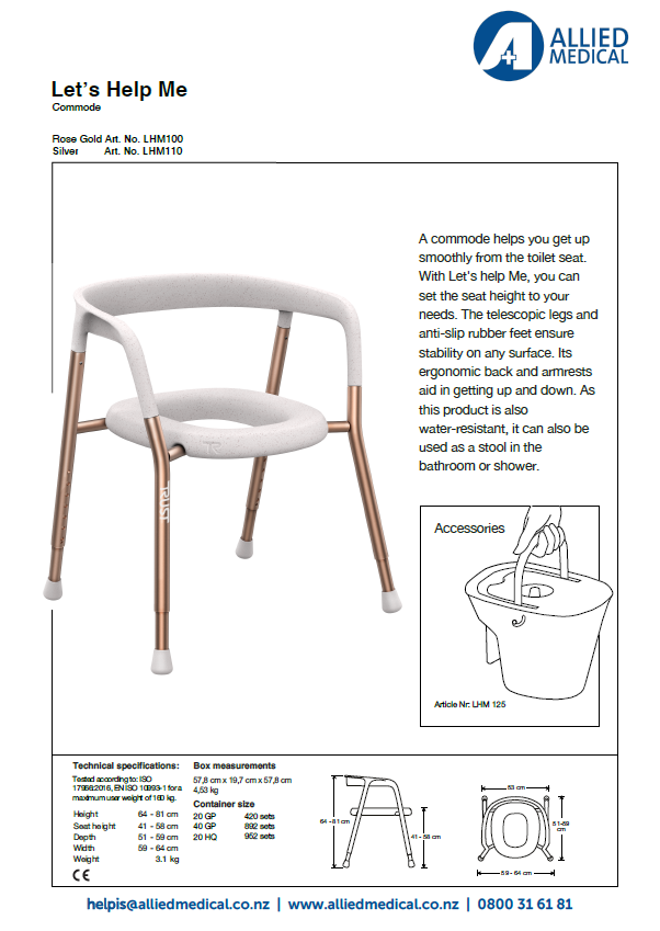 The Let's Help Me Commode is a height-adjustable, compact and versatile commode designed with comfort, hygiene and modern aesthetics in mind. Use it independently, over the toilet, or as a shower stool. Bucket attachment sold separately to suit your needs and preferences.