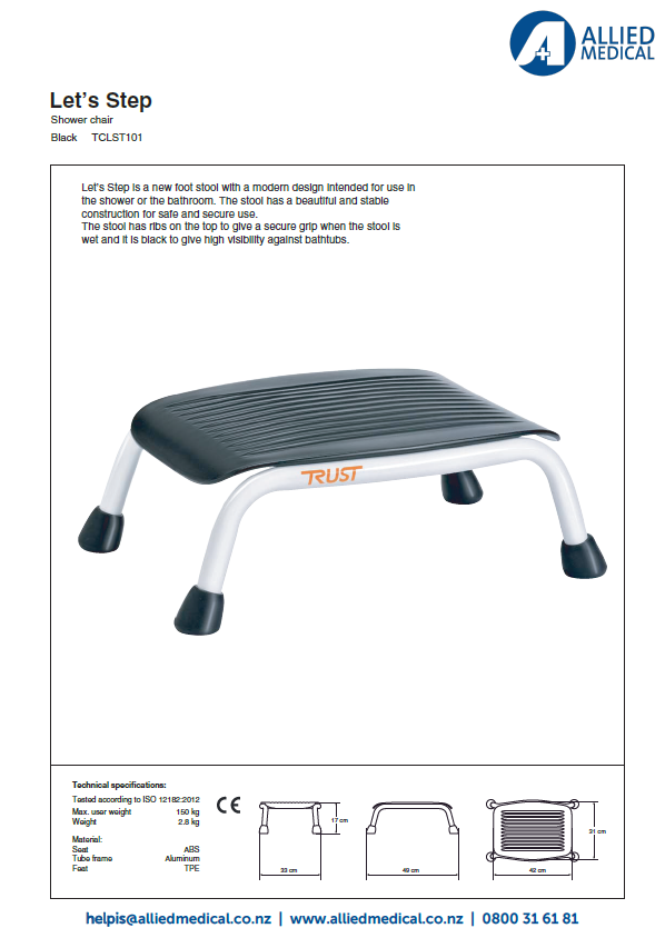 The Let’s Step Footstool by TrustCare is a modern, stable step designed to make reaching, stepping, or moving around the home safer and more comfortable. Whether you need support stepping into the shower, reaching a high shelf, or creating a better footing in the bathroom, Let’s Step offers reliable grip and stability.
