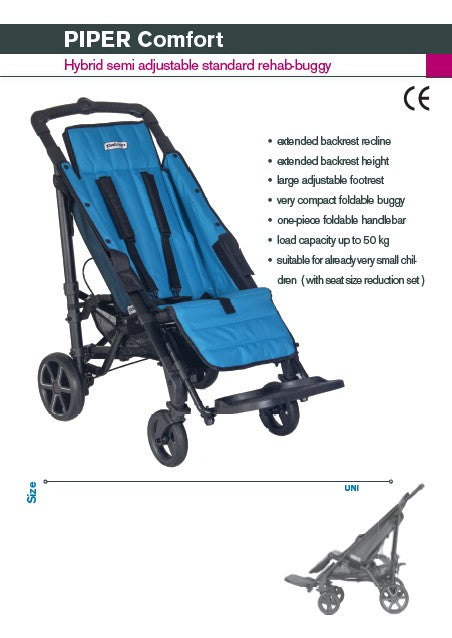 The Piper Comfort buggy is used for short term transportation and activities. It has a fully foldable undercarriage made from lightweight aluminium and is available in one adaptable size. The seat to footrest length can be adjusted and by using an optional additional seat size-reduction inlay and footplate raiser the buggy can be adjusted to fit the child's changing size from a child of approximately two up to a maximum load of 50kg's.
