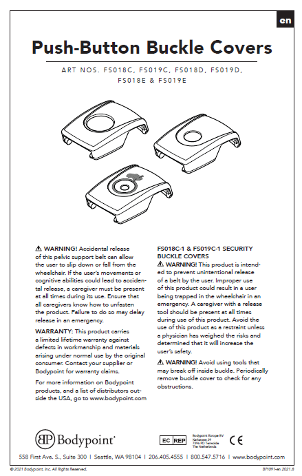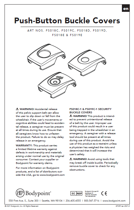 The Bodypoint® Buckle Security Cover (Push Button) is designed to prevent users from accidentally or intentionally releasing their pelvic belt. This secure cover fits over the push-button buckle of Bodypoint belts and is ideal for individuals who may have cognitive or behavioural challenges, helping to promote safety without compromising comfort.