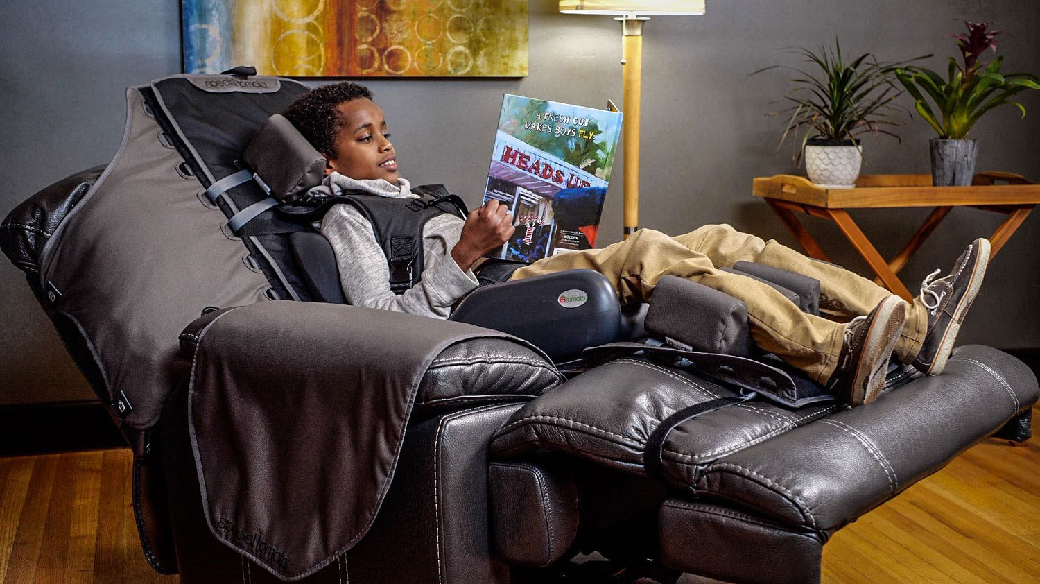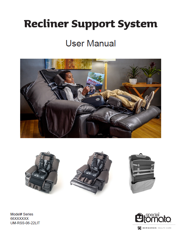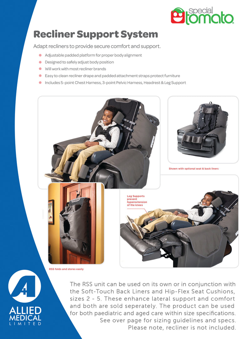 The Special Tomato Recliner Support System (RSS) comes with an adjustable 5-point chest harness and 3-point pelvic harness to safely maintain a stable well-aligned position of the trunk and pelvis. The RSS offers a firm yet comfortable platform for positioning the hips and pelvis for proper body alignment. The adjustable height headrest promotes a midline position of the head and the leg supports with height and lateral adjustability to cradle lower extremities in neutral alignment and discourage hyperextension of knees. The easy to clean drape is secured with four padded straps to protect furniture and will work with most recliner brands.