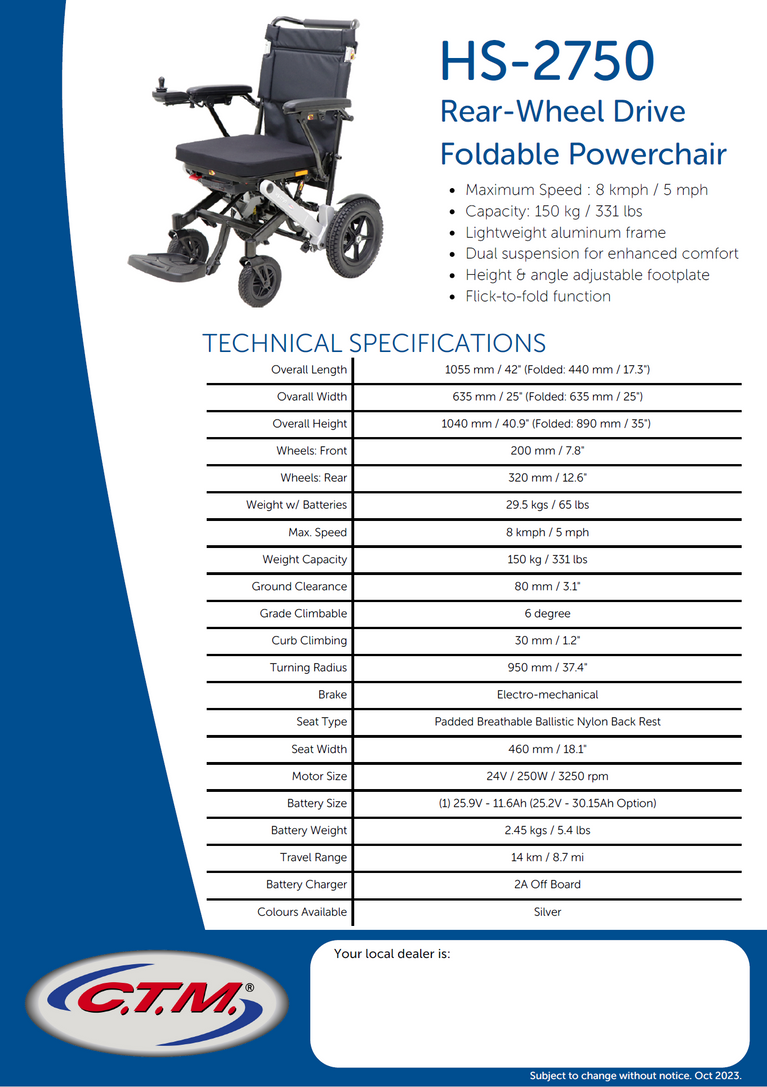 Available for purchase through our partner stockists. View our stockist page to find your local stockist. The CTM HS-2750 is a cost effective, rear-wheel drive foldable powerchair that comes complete with a Padded Breathable Ballistic Backrest, a height and angle adjustable footplate, flip up armrests and an easy to use controller. Super lightweight and folds neatly to easily transport. Ideally suited to indoor or urban environments, the HS-2750 has all the features to keep you moving at home and out and about in your community.