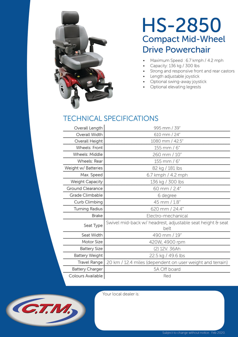 Available for purchase through our partner stockists. View our stockist page to find your local stockist. The CTM HS-2850 is a cost effective, mid-wheel drive powerchair comes complete with a captain style seat, flip up footplate, adjustable flip up arm rests and an easy to use LiNX controller. With six wheels on the ground at all times and full coil over suspension, the HS-2850 provides a very stable and comfortable ride in most environments. Ideally suited to indoor or urban environments, the HS-2850 has all the features to get you out and about, living life.