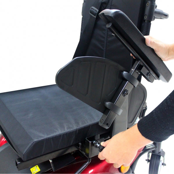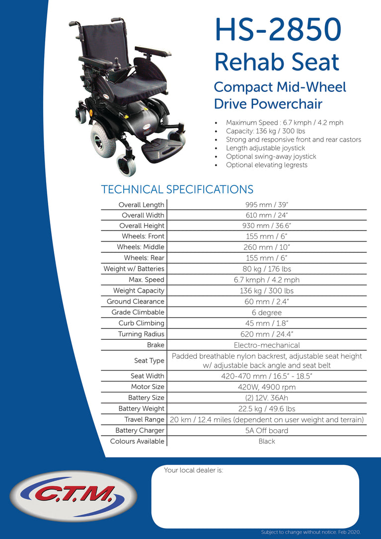 Available for purchase through our partner stockists. View our stockist page to find your local stockist. The CTM HS-2850 Rehab Seat is a mid-wheel drive powerchair comes complete with a rehab seat, flip up footplate, height adjustable arm rests and an easy to use LiNX controller. With six wheels on the ground at all times and full coil over suspension, the HS-2850 provides a very stable and comfortable ride in most environments.
