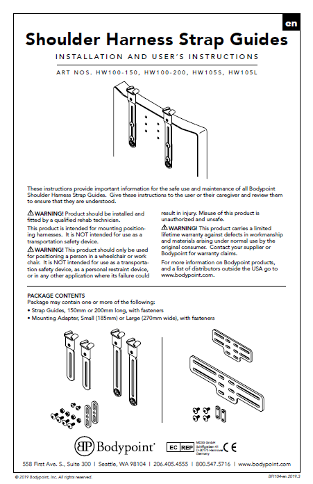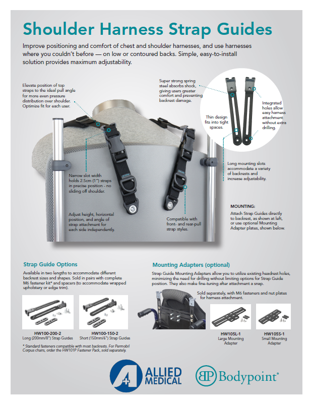 Made from spring steel and available in two lengths, the Strap Guides provide independent adjustment on each side for optimal pressure distribution and user comfort. Compatible with front- and rear-pull styles and all Bodypoint end fittings, these guides install easily with the included fastener kit or optional Mounting Adapters.