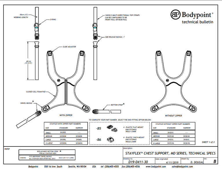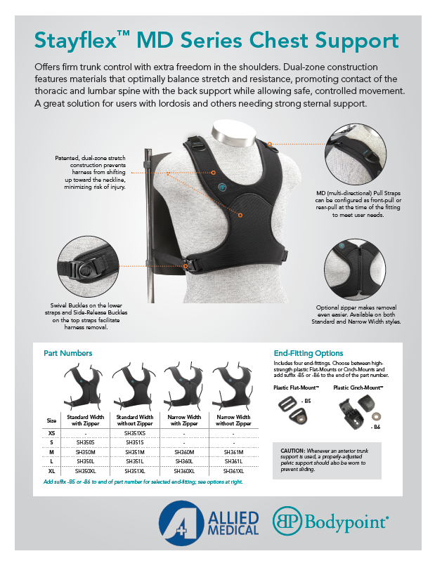 Bodypoint Stayflex Narrow Chest Supports provide secure chest support with firm trunk control and extra shoulder freedom. Available in three styles with durable Flat-Mount attachments and optional zipper.