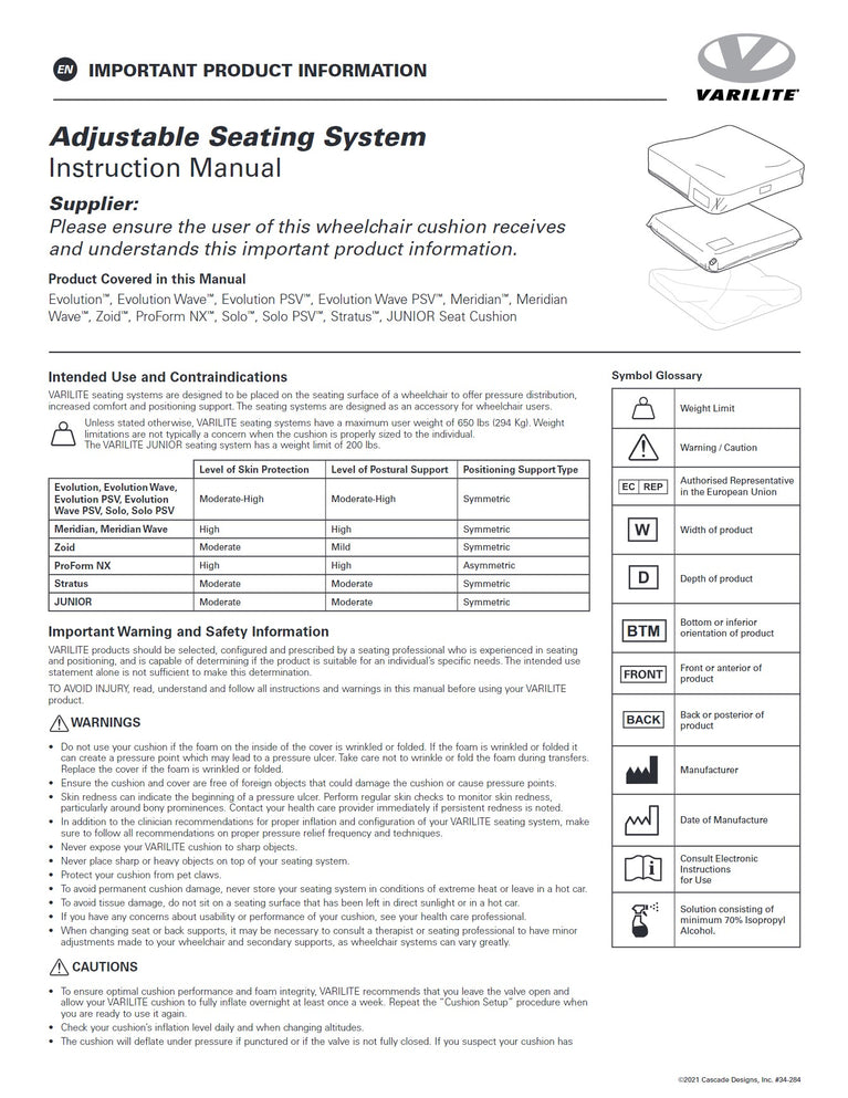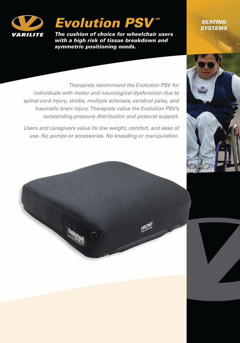 The Evolution cushion is designed and constructed for users at high risk of tissue breakdown and who have moderate positioning needs. Individuals with motor and neurological dysfunction due to spinal cord injury, stroke, multiple sclerosis, cerebral palsy, and traumatic brain injury are the most frequent, though not the only, users of the Evolution cushion. We recommend purchasing a spare cover with all cushion purchases.