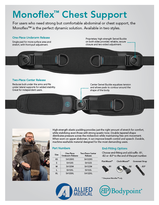 The Bodypoint Monoflex Chest Support with Underarm Release offers strong yet comfortable support for users needing additional trunk control. Designed with a high-strength elastic pad and flat mount attachment, it supports dynamic movement while distributing pressure evenly across the torso.