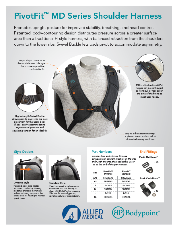 The Bodypoint PivotFit Shoulder Harness offers optimal postural support with a contoured fit and asymmetry-accommodating Swivel Buckle. Available in Standard and Dynamic styles.