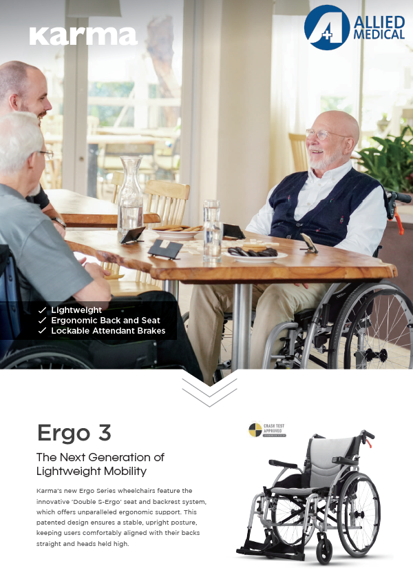 The Karma Ergo 3 is a next-generation lightweight wheelchair, designed for comfort, function, and improved posture. With patented ergonomic seating, intuitive caregiver features, and ultra-lightweight design, it supports healthy sitting and easy transfers throughout the day.