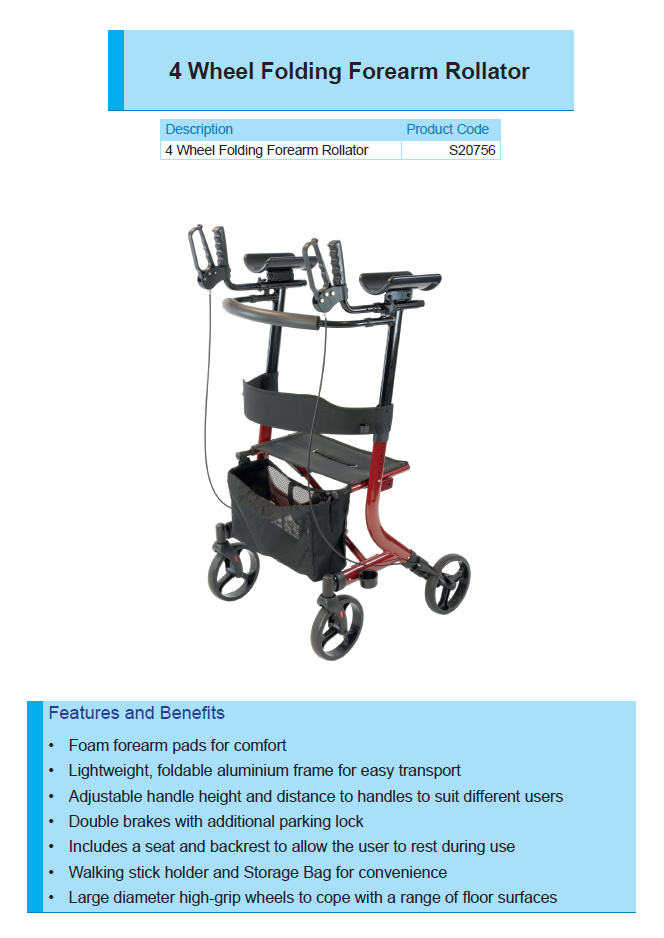 The 4 Wheel Forearm Rollator offers cushioned forearm supports, adjustable handle heights, and a lightweight frame, ensuring comfort and stability for users with limited grip strength.