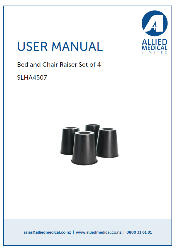 Moulded plastic cone raisers to raise the chair or bed, allowing the user to get in and out easier. A standard chair or bed can be raised by 150 mm. Raisers are steady when they are in use.
