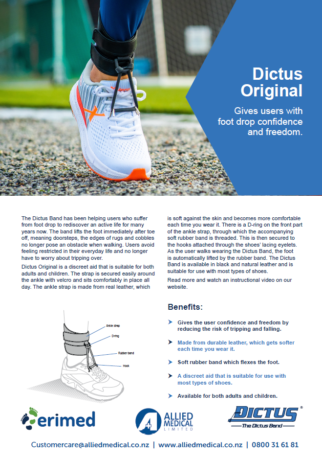The Dictus Band is an orthosis to help people who suffer from Drop Foot. Drop Foot (or Foot Drop) is a neuromuscular (nerve and muscle) disorder that affects the patient's ability to raise their foot at the ankle.