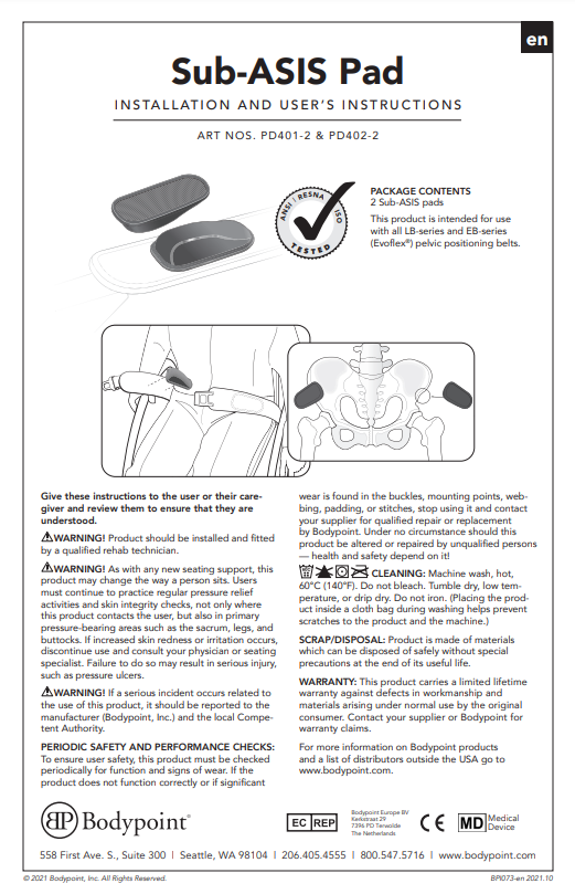 Bodypoint Synergel Sub-ASIS pads are comfortable gel pads that fill anatomical gaps and prevent a belt from digging or riding up, improving control of pelvic obliquity and rotation while minimizing abdominal pressure.