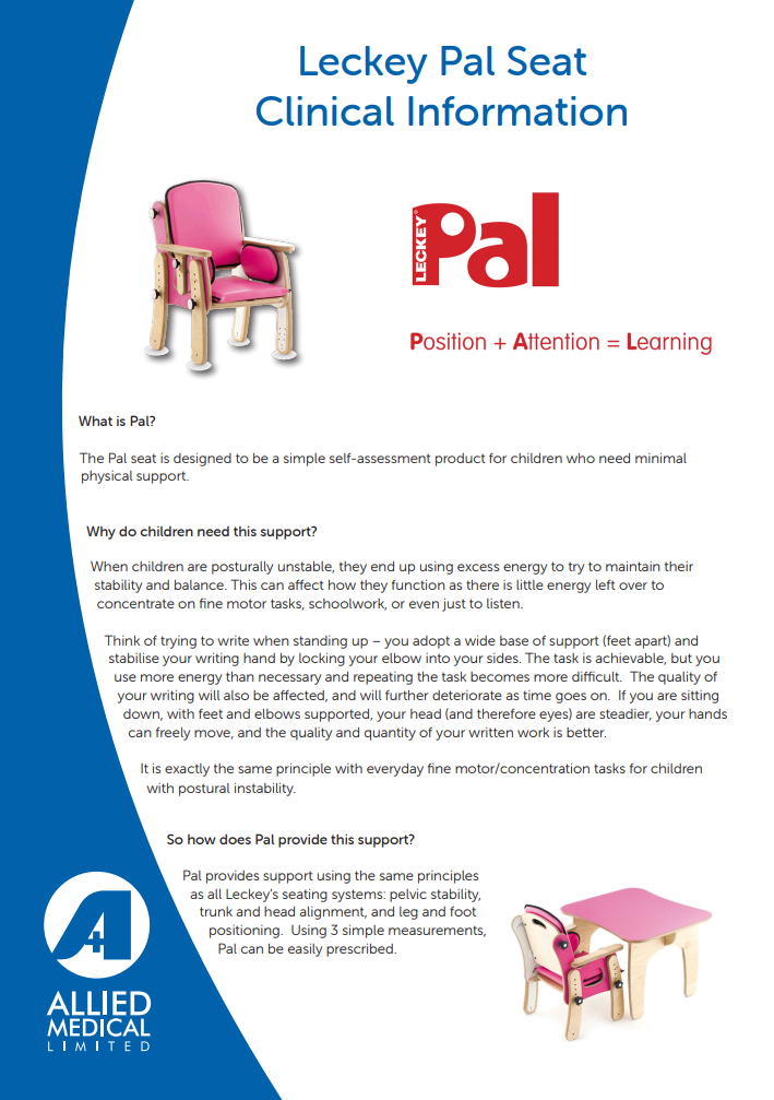 Posture + Attention = Learning. PAL is an attractive, robust and easy to use classroom and nursery seating system for kids of 1-12 years of age, with mild to moderate postural needs. The PAL Seat is designed to give improved stability, which helps reduce fatigue and allows the child longer periods of concentration and fine motor activity.