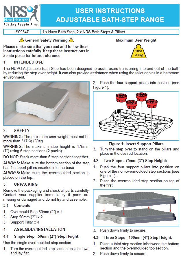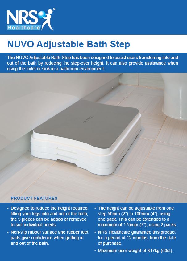 The NUVO Adjustable Step is designed to help you or the person you care for to more easily get into and out of their bath, or to help them use their bathroom toilet or sink. This step reduces the height needed to step over into or out of the bath as well as being used as a step in other rooms of the house when needed. With a non-slip rubber surface and rubber feet pads to help prevent slipping as well, the NUVO step helps to provide user confidence and security.