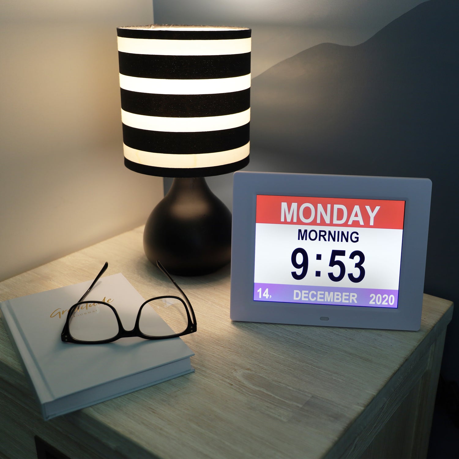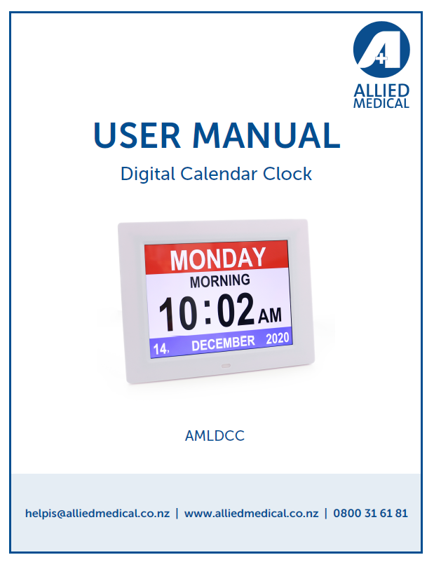 This easy-to-read clock clearly displays the full day, date and time in bold, high-contrast text. Ideal for people experiencing memory loss or visual impairment, it provides daily reassurance and orientation. Includes automatic Daylight Saving Time adjustments.
