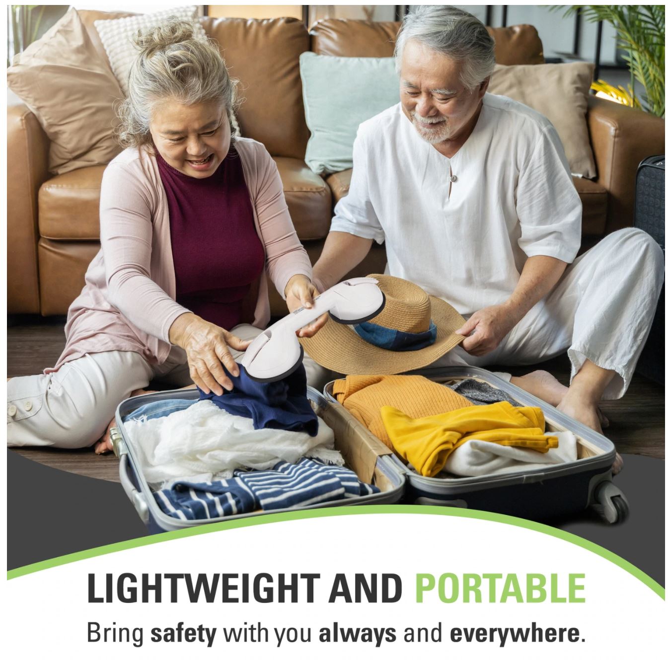 At home, when traveling (these fit great in a suitcase or purse!) or anywhere you can attach our suction pads to a smooth, flat, non-porous surface. Our Portable Grab Bars are great for use on fiberglass and acrylic tub and shower surrounds, porcelain, ceramic, Glazed Tiles, Corian, Cultured Marble, and Glass (to name a few). Use it for a balance assist on the vanity or attached to the counter in the kitchen or while seated at a large table.