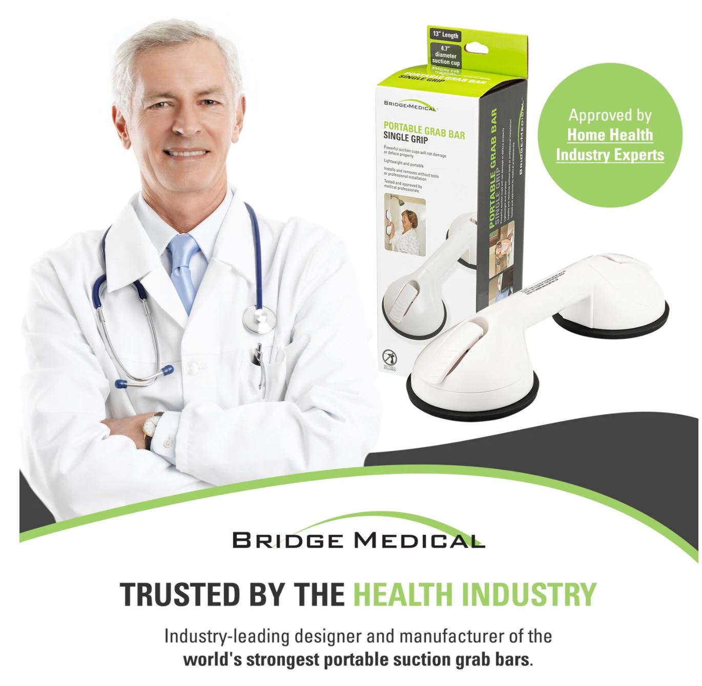 The single grip is the most portable of the Bridge Medical grab bars as it can be installed and removed without any tools or professional installation. The durable commercial-grade suction cups are the strongest on the market.