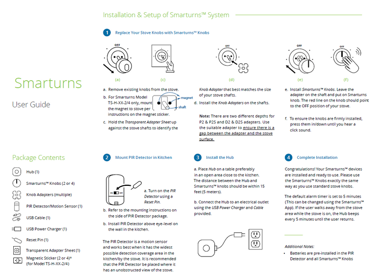 When the stove is turned on, the Smarturns knobs notify the hub. The motion sensor detects whether the stove is being attended. If no movement is detected within the preset time, the hub sounds an alert in the home.