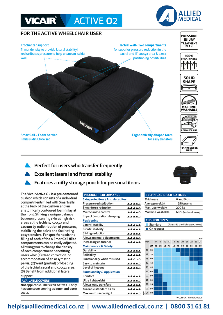 The Vicair Active O2 9 cm High is a lightweight, breathable and stable cushion designed for active wheelchair users. With SmartCells in the rear and ergonomically shaped foam at the front, it supports comfort, easy transfers and everyday mobility.