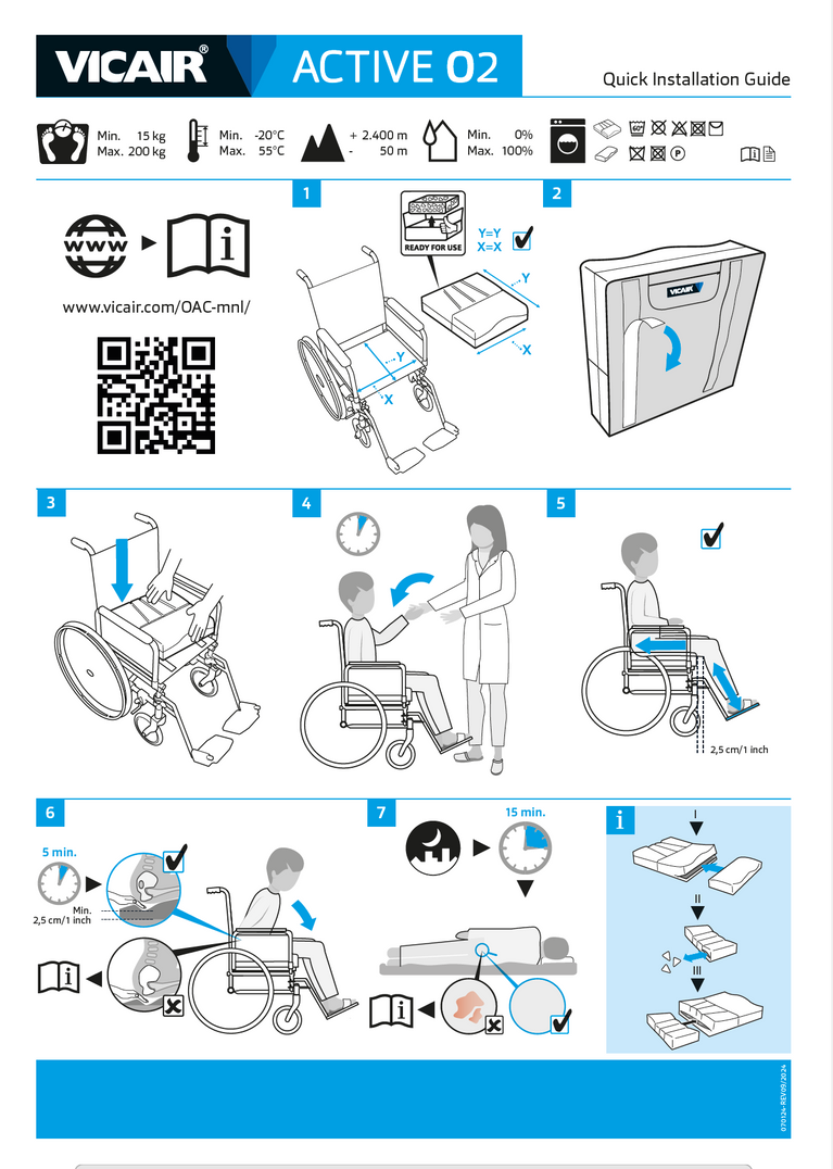 The Vicair Active O2 9 cm High is designed specifically for active wheelchair users who need a cushion that supports movement, frequent transfers and reliable pressure care. Combining ergonomically shaped foam at the front with four rear SmartCell compartments, it provides excellent pelvic stability while offloading the sitting bones and tailbone. The foam front offers a steady surface for smooth transfers and improved wheelchair handling, while the rest of the cushion remains fully breathable and machine washable at 60°C once the foam insert is removed. Lightweight at around 1.25 kg, it is ideal for manual wheelchairs and for users with low to very high pressure injury risk. A handy front storage pouch keeps personal items within easy reach.