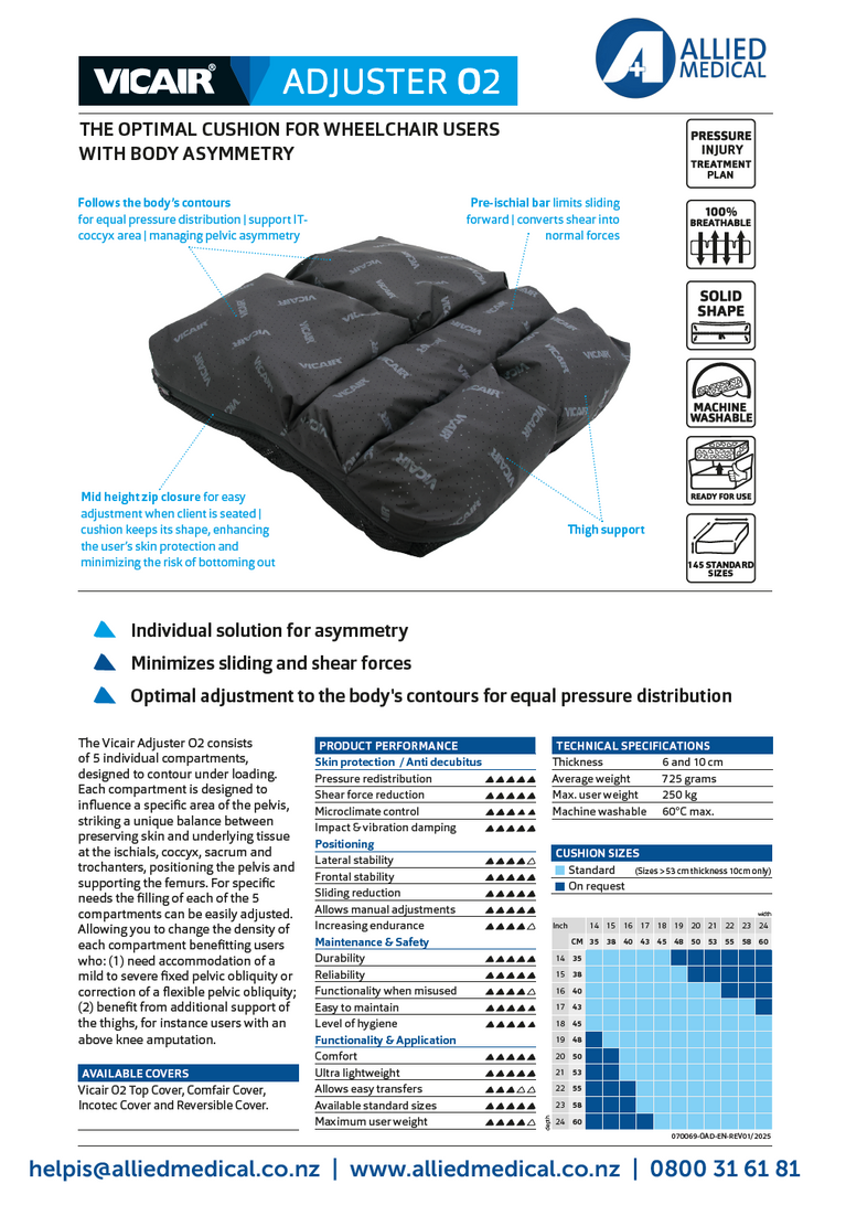 The Vicair Adjuster O2 10 cm High is a breathable, fully adjustable cushion designed for wheelchair users with body asymmetry. It offers total immersion, excellent pressure redistribution and reliable stability for everyday comfort and protection.