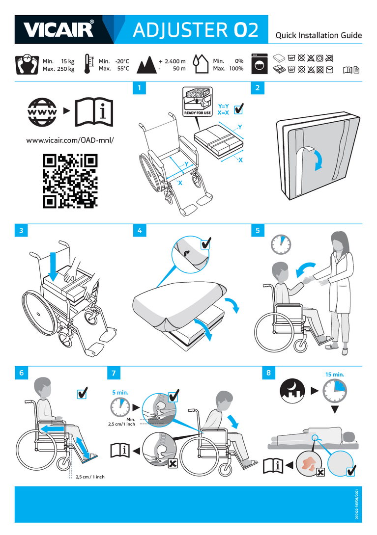 The Vicair Adjuster O2 10 cm High is ideal for wheelchair users with asymmetric body contours or amputations. It provides greater immersion than the 6 cm version and automatically compensates for small obliquities, while allowing individual adjustment for more significant asymmetry. Designed to enhance comfort, stability and skin protection, it features a pre-ischial section that helps prevent sliding forward and promotes equal pressure distribution. Filled with air filled SmartCells, the cushion supports users at low to very high pressure injury risk and is fully breathable to maintain optimal temperature and moisture regulation. It is also machine washable at 60°C without removing the SmartCells, offering excellent hygiene and ease of care.