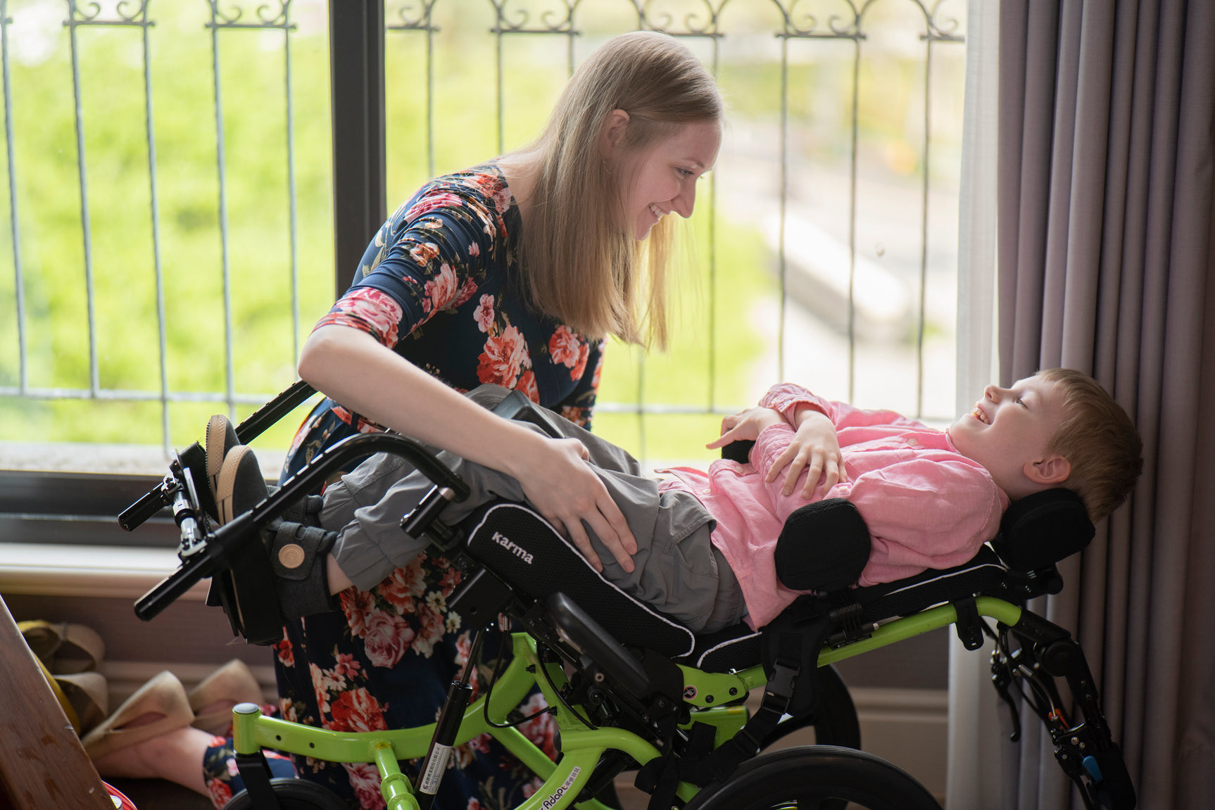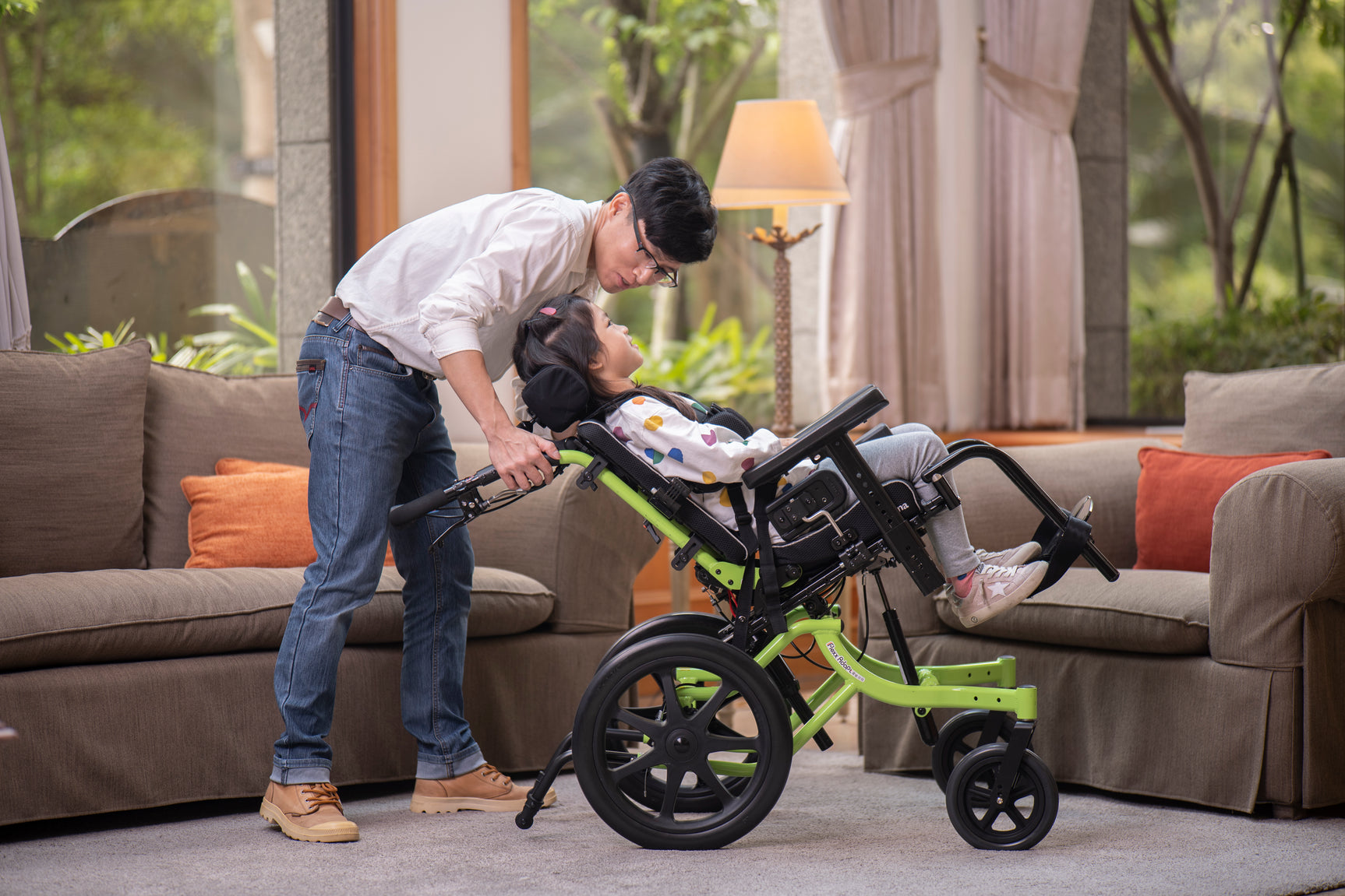 - Nearly horizontal trunk positioning facilitates transfers, daily care (such as nappy changes), and reduces postural fatigue.