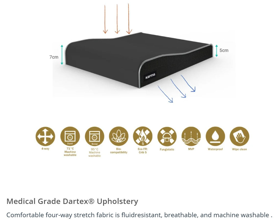 - Cushion shaped to support a neutral pelvic position and reduce sliding.